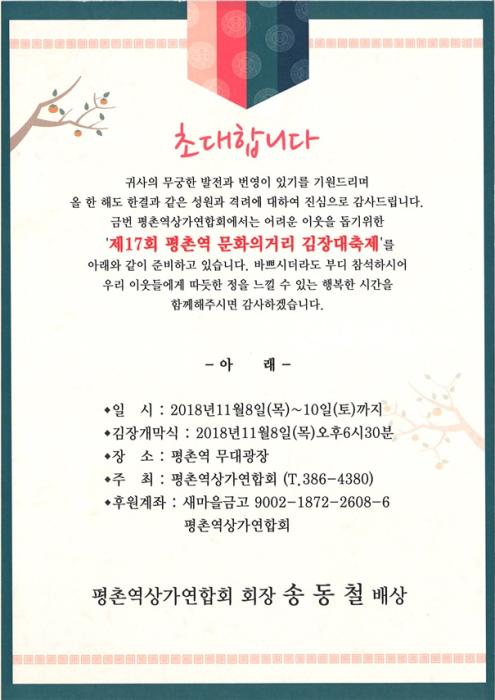 안양시(시장 최대호)는 평촌역상가연합회가 주최하는「제17회 평촌역 문화의 거리 김장대축제」를 8일부터 10일까지 개최한다고 7일 밝혔다.
