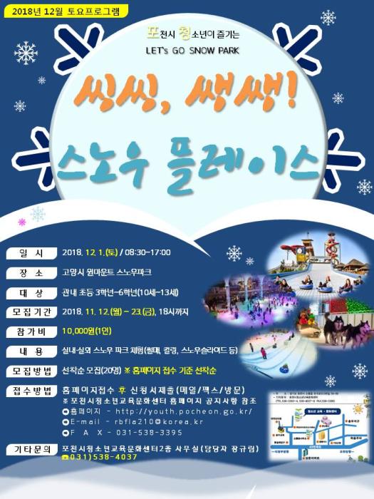 포천시(시장 박윤국)는 오는 내달 1일 토요프로그램 ‘씽씽, 쌩쌩! 스노우 플레이스’라는 주제로 고양시에 소재한 원마운트 스노우파크를 방문해 4개의 테마를 주제로 관내 청소년들에게 겨울철 스포츠 활동을 제공하고 겨울철 잊지 못할 추억을 만들 수 있는 프로그램을 진행할 예정이다.