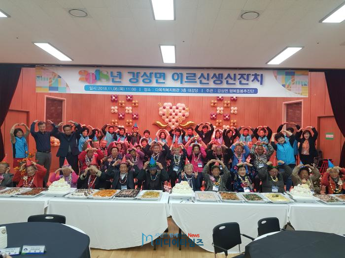 이날 행사는 자연숲, 숲속나무, 세종, 강상어린이집 원생들이 만든 사탕목걸이를 어르신들에게 달아드리며 귀여운 율동을 선보였고, 강상주민자치센터 회원들의 오카리나, 한국무용, 골드, 재즈댄스, 노래교실 등 멋진 축하공연에 이어 사회자의 흥겨운 진행과 함께 맛있는 음식을 대접하였으며, 드림요양원과 ㈜팔복농산에서 준비한 정성스런 선물 전달로 막을 내렸다.