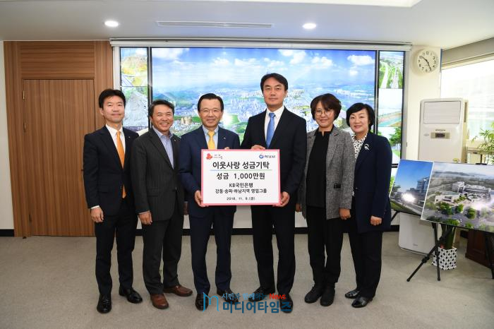 KB국민은행 강동·송파·하남지역영업그룹(대표 박형수)은 9일 하남시(시장 김상호)에 이웃돕기 성금 1천만원을 기탁했다. 이날 김상호 하남시장, 박형수 대표 등 관계자들이 참석해 시장실에서 기탁식을 가졌다.