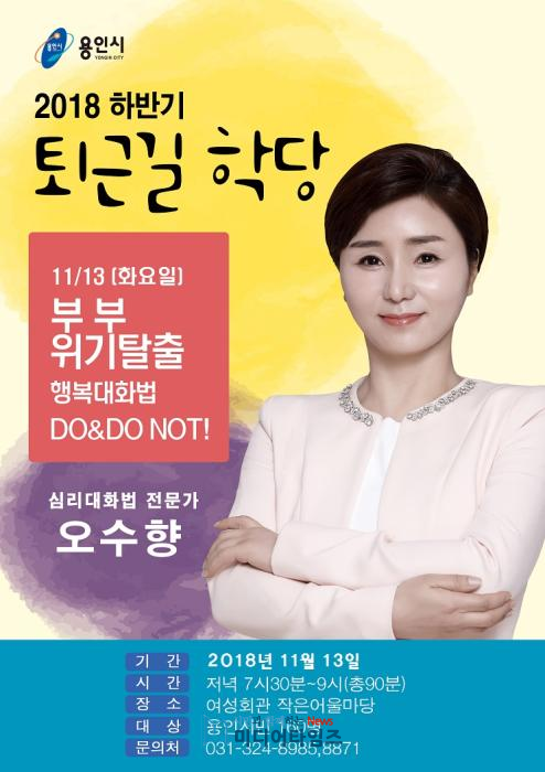 용인시는 오는 13일 여성회관 작은어울마당에서 야간에 여는 ‘퇴근길 학당’에 대화심리전문가 오수향 작가 초청 강연을 연다.
