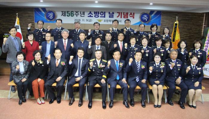 포항북부소방서(서장 이상무)는 9일 오전 11시 3층 대회의실에서 제56회 소방의 날을 맞아 시민의 안전과 소방행정발전에 기여한 소방공무원과 민간인에 대한 유공자 표창 등 기념행사를 가졌다고 전했다.