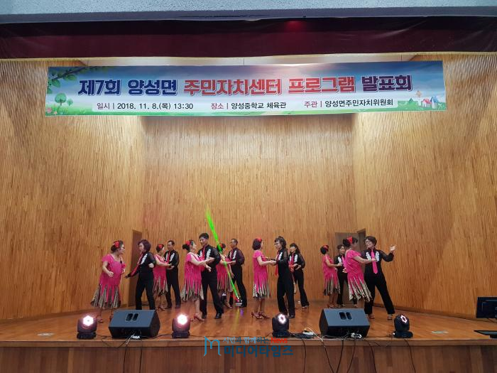 이날 발표회에서는 양성면 주민자치센터에서 운영하고 있는 기체조, 스포츠댄스, 요가, 라인댄스, 노래교실, 밴드교실 등 7개 프로그램 수강생들이 그동안 준비한 실력을 마음껏 발휘했으며 최선을 다하는 수강생들의 모습에 참석자들의 박수 갈채가 이어졌다.