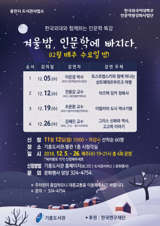 용인시 기흥도서관은 오는 12월 5일부터 26일까지 시청각실에서 매주 수요일에 한국외국어대 교수진이 진행하는 인문학 특강을 연다. 한국외대 인문역량강화사업단이 주최하는 이번 특강 ‘겨울밤, 인문학에 빠지다’는 유럽 문화를 주제로 한 대학 연구진의 연구 성과를 지역사회와 공유하고자 마련되는 것이다.