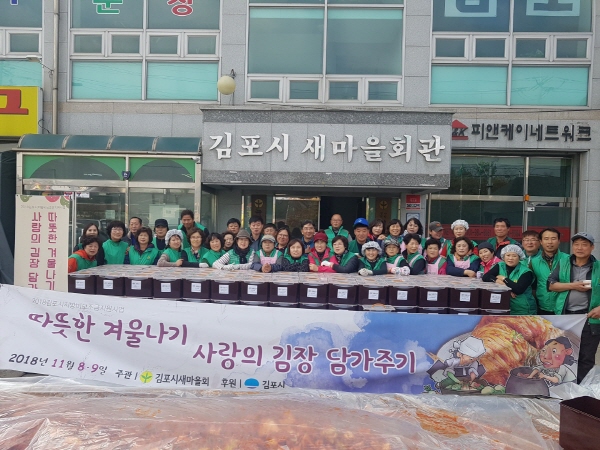 김포시새마을회는 취약계층과 복지사각지대에 있는 이웃과 따뜻한 정을 나누기 위해 지난 8일과 9일 이틀 동안 ‘사랑의 김장 담가주기’ 행사를 김포시 새마을회관에서 가졌다. 이날 행사에는 정하영 김포시장, 신명순 시의장을 비롯한 정일성 회장, 김미경 시 부녀회장, 읍면동 새마을 남녀지도자 등 200여명이 참여했으며, 정성껏 담근 김장 381통을 홀몸노인, 북한이탈주민, 관내 복지시설 등에 전달했다.