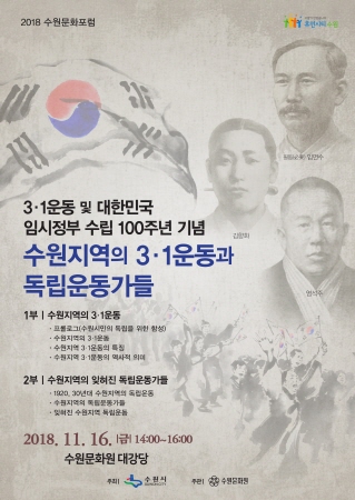 수원시는 오는 16일 오후 2시 팔달구 수원문화원에서 ‘수원지역의 3·1운동과 독립운동가들’을 주제로 ‘2018 수원문화포럼’을 연다.