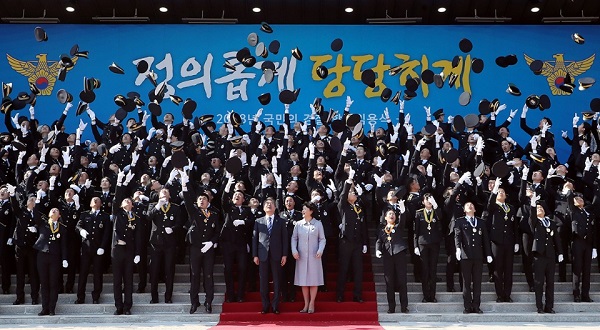 | 문재인 대통령 부부가 지난 3월 충남 아산 경찰대학에서 열린 ‘2018년 경찰대학생·간부후보생 합동 임용식’에서 미래 경찰 주역들인 초급 간부들과 기념촬영을 하고 있다.<사진=청와대> |