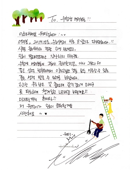 특히 주원탁은 손편지를 통해 “2019년도 수능시험이 바로 코앞으로 다가왔습니다. 시험 준비하느라 정말 고생 많으셨고 많이 떨리시겠지만 긴장하지 마시구요. 수험생 여러분들이 그동안 준비한 만큼, 아니 그보다 더 좋은 실력 발휘하셔서 이루고 싶은 것들 모두 이루실 수 있는 좋은 성적 받을 수 있기를 바랍니다”라고 응원을 이어갔다.