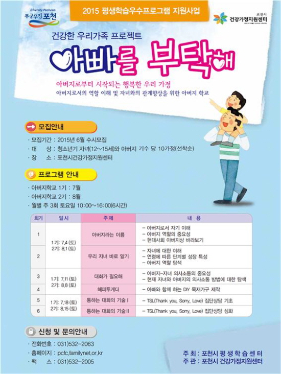 포천시 건강가정지원센터(센터장 박수경)는 2015년 평생학습우수프로그램 지원사업 ‘아빠를 부탁해‘ 프로그램 참여 가족을 수시 모집하고 있다.