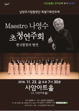 남양주시립합창단이 오는 23일 오후 7시 30분, 사암아트홀에서 마에스트로 나영수 지휘자를 초청하여 한국합창의 향연을 펼칠 예정이다.