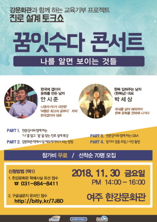 한강문화관은 한국갭이어과 함께 오는 30일에 교육기부 프로젝트 ‘꿈잇수다 토크콘서트’를 한강문화관 1층 다목적홀에서 여주여자 중학교를 비롯한 지역 청소년을 대상으로 개최한다. 이번 행사는 전국 5개 강문화관이 교육부 주관 교육기부 체험기관으로 선정되어, 지역 내 초·중·고교 청소년 대상‘나를 알면 보이는 것들’에 대한 진로설계 특강으로 순회 공연 방식으로 진행된다.