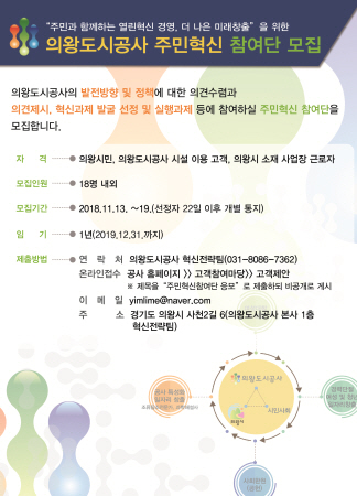 의왕도시공사는 오는 19일까지 사회적가치 구현과 효율적인 주민참여 경영을 위한 ‘주민혁신 참여단’을 모집한다. 주민혁신 참여단은 의왕시민이거나 의왕시 소재 사업장 근로자, 의왕도시공사 시설물 이용고객을 대상으로 모집하며, 모집인원은 18명 내외다.