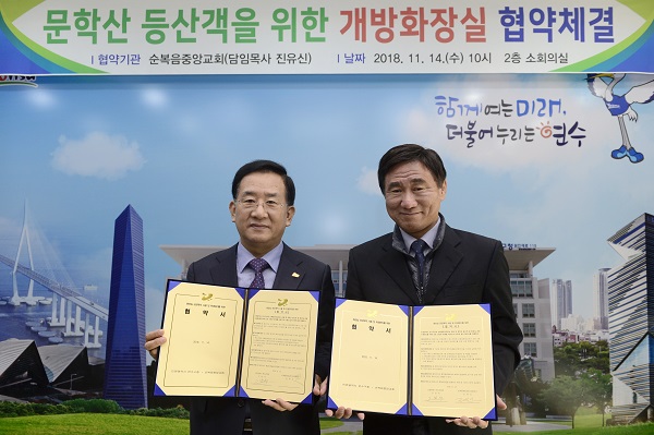 연수구는 14일 순복음중앙교회와 문학산 등산객을 위한 개방화장실 협약을 체결했다.
