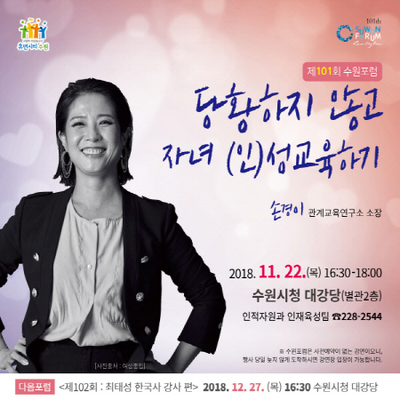 수원시는 오는 22일 오후 4시 30분 수원시청 별관 2층 대강당에서 ‘당황하지 않고 자녀 성 교육하기’를 주제로 101번째 수원포럼을 연다. 포럼은 손경이 관계교육연구소 소장의 강연으로 진행된다.