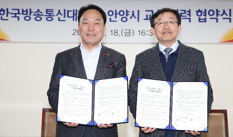 안양시와 한국방송통신대학간에 학술교류, 문화시설 사용 등 교류협력을 도모하기 위한 양해각서 체결이 18일 안양시청에서 있었다.