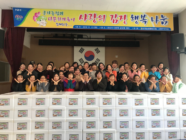 행사를 위해 군자농협 본점이 재료 일체를 후원했으며, 군자농협 봉사자와 다문화가족 60명이 함께 김장을 담그며 화합의 시간을 가졌다. 이날 담근 120박스의 김치는 행사에 참여한 다문화가족과 지역 내 다문화배경 소외계층에게 배부됐다.