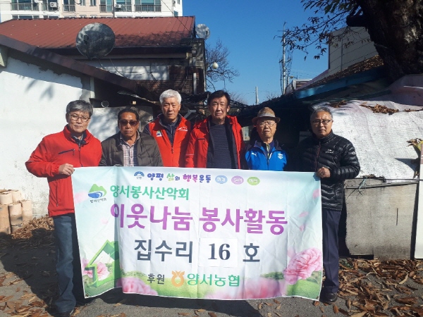양평군 양서봉사산악회에서는 관내에 열악한 주거환경에서 거주하고 있는 취약계층 가구의 쾌적한 환경을 조성하기 위해 홀수달 셋째주에 정기적으로 집수리 자원봉사 활동을 이어오고 있다. 지난 14일에도 저소득 주거취약 5가구의 집수리 봉사활동을 펼쳤으며 이번 봉사는 양서면행복돌봄추진단에서 공사에 소요되는 재료비 등을 부담했고 집수리는 봉사산악회에서 진행했다.