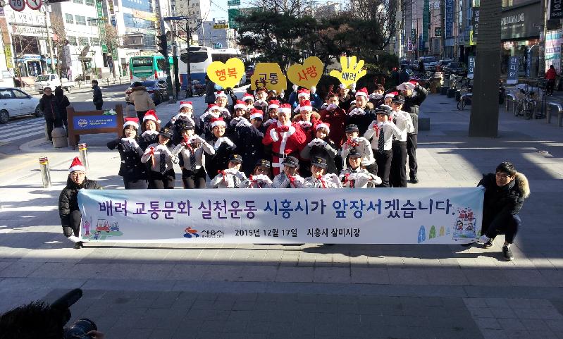 이날 김윤식 시흥시장은 산타클로스 복장을 하고 녹색어머니회, 주․정차단속요원, 공무원 등 50여명과 함께 ‘로고송’에 맞추어 율동을 하며 ‘배려 교통문화’ 실천 운동 릴레이에 함께 했다.