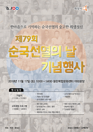 화성시가 제79회 순국선열의 날을 맞아 오는 17일 동탄복합문화센터에서 기념행사를 개최한다. 시는 매년 광복회 경기도지부 주관으로 열리던 기념행사를 올해부터 시 주관 행사로 개최해 순국선열에 담긴 의미를 공유하고 애국정신을 기릴 수 있도록 할 계획이다.