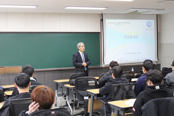 15일 충남도립대학교 진리관에서 허재영 총장이 ‘충청·충청인의 정체성 발굴과 미래비전’을 주제로 충남학 특강을 펼치고 있다.