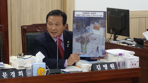 이날 김명원 의원은 관련 사진을 제시하며 “안전난간대도 없이 철근을 시공하고 있는데 청년들이 일하러 오겠느냐”라고 묻고 “경기도청 신청사 현장에서도 안전요원은 원수급회사인 태영건설 직원이고 건설현장노동자는 1차 하도급회사 직원인데, 안전시설 설치가 미비하여 안전요원에게 얘기하면 무조건 일하지 말라고 한다”며 건설현장 안전문제에 대해 집중 질의했다.