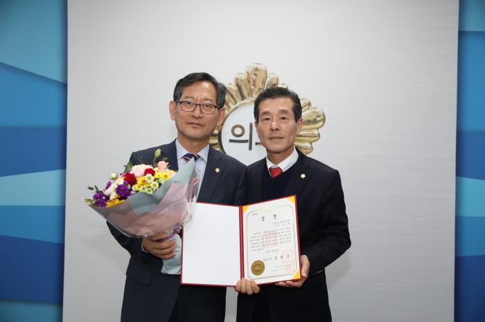 이번 국회의장상은 지난 달 29일 지방자치의 날 행사에서 지방의회와 지방자치 발전 유공에 따라 수여한 것으로, 상장은 16일 제255회 임시회 전체의원 간담회에서 전수했다.