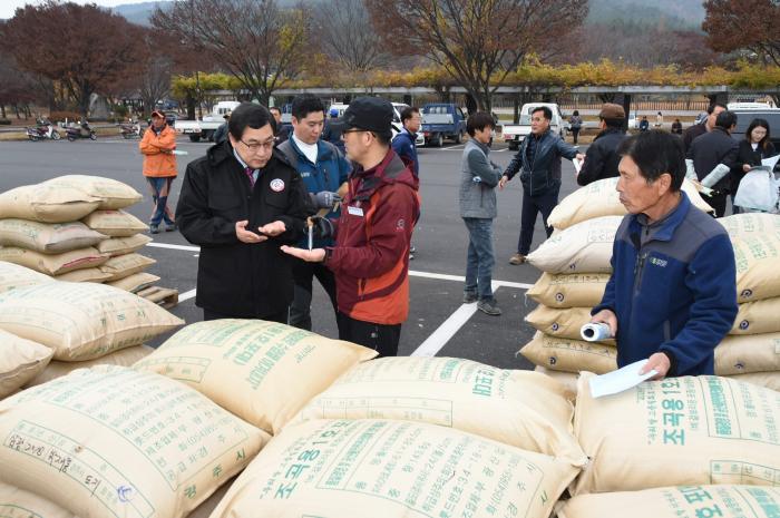 주낙영 경주시장이 16일 2018년산 공공비축미 건조벼 매입 현장인 통일전 광장을 찾아 농업인들의 의견에 귀 기울이고 농협과 농산물품질관리원 등 관계자들을 격려했다.