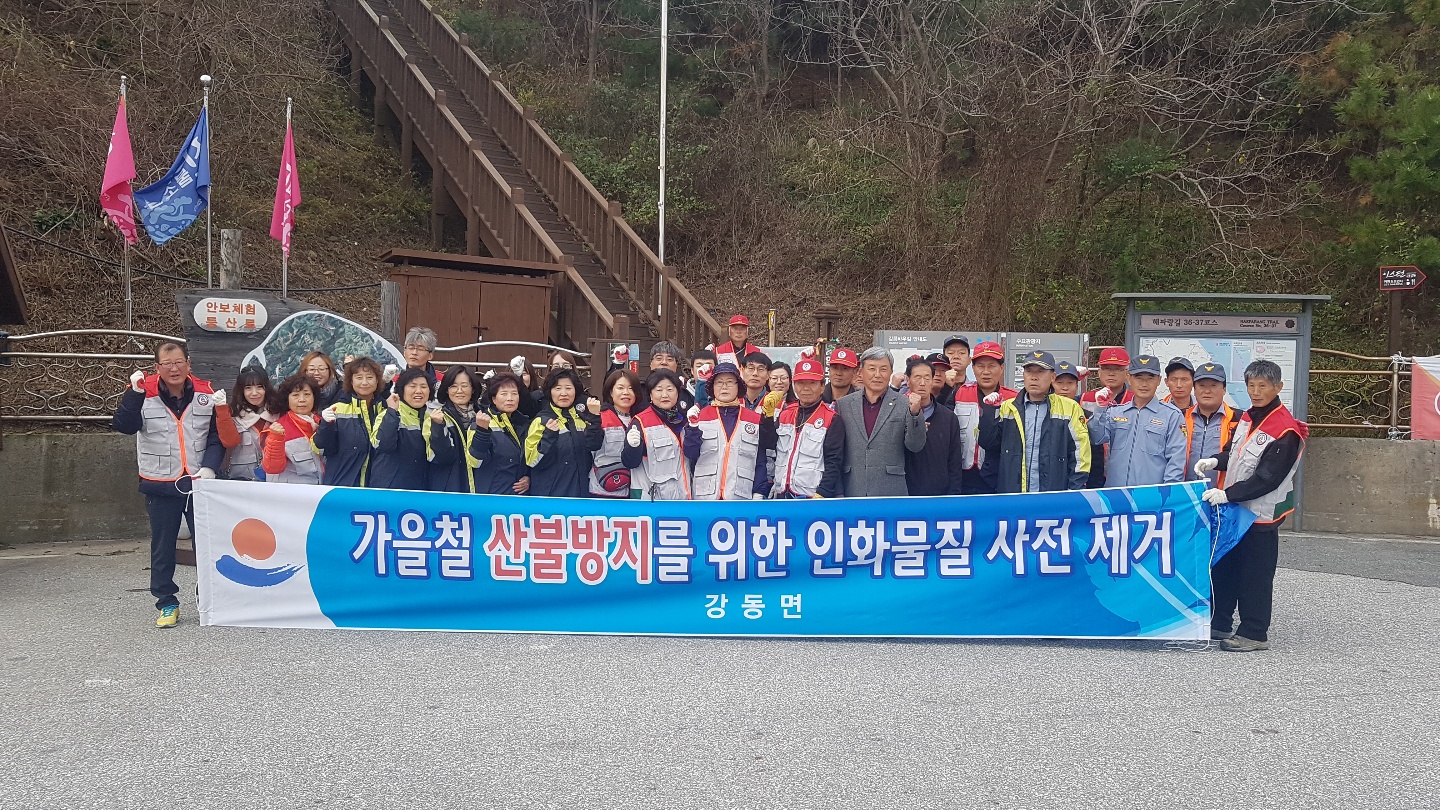 또한 지난 16일에는 강동면 이장협의회, 새마을부녀회 등 자생단체 회원과 면 직원 30여명이 인화물질 사전제거 합동 작업에 참여하여 안보등산로 입구에서 활공장까지 2.5㎞ 구간의 등산로 주변에 무단방치된 쓰레기 수거 및 가을철 산불 예방 홍보 활동을 실시했다.