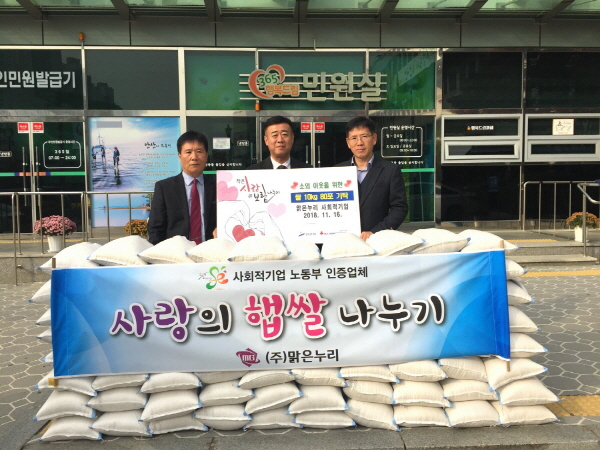 안산시 단원구에 위치한 맑은누리 사회적기업은 지난 16일 안산지역 소외계층을 위한 후원품으로 쌀 10kg 80포대를 기탁했다.