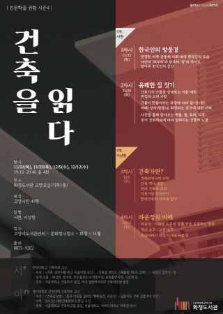 고양시 화정도서관이 한국인의 공간에 대해 고찰하고 건축과 라운징에 대해 알아보는 시간을 마련했다. 오는 22일부터 오후 7시 10분 총 4회 일정으로 직장인을 위한 야간 문화프로그램 ‘건축을 읽다’를 운영한다.
