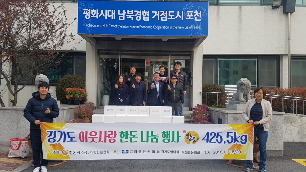 대한한돈협회 포천시지부에서는 지난 16일 추운 겨울을 대비해 따뜻한 마음을 전달하고자 한돈인들이 포천에서 직접 키운 돼지고기 426kg을 포천시를 통해 관내 차상위 계층 115가구에 기부했다.