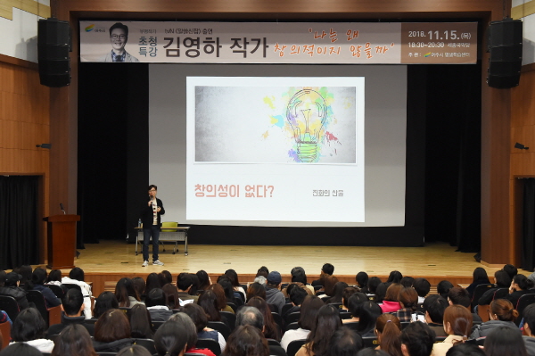베스트셀러 ’오직 두 사람‘ 등의 저자이자 TV 프로그램 ‘알쓸신잡’ 에 출연하여 인지도를 높인 ‘김영하 작가’가 ‘창의성’에 관련한 여러 이야기와 ‘스토리텔링의 연관성’ 등에 대해서 명 강의를 펼쳤다. 김영하 작가는 좌석을 가득 채운 시민들이 공감할 수 있는 일상 속의 적절한 예시와 재치있는 유머로 참석한 시민들로부터 큰 호응을 얻었다.