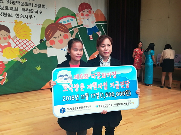 한국생활개선양평군연합회는 2013년부터 올해까지 총 1천6백5십만원의 모국방문 지원금을 전달해 9가정의 다문화 가정이 고향에 방문할 수 있도록 지원했다.