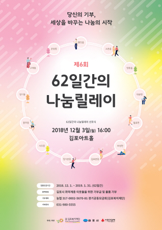 특히, 12월 3일 오후 4시 김포아트홀에서 진행되는 제6회 62일간의 나눔릴레이 기념식은 김포시민의 사랑과 나눔을 함께하고자 선착순 무료입장으로 진행되며 소정의 기념품이 제공된다.
