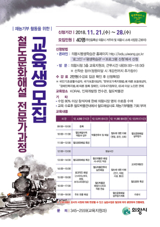 의왕시는 철도와 관련된 의왕시의 역사·문화를 널리 알리고 함께 공유하기 위한 철도문화해설 전문가과정에 참여할 교육생을 모집한다.