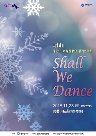 두 번째로는 다음날인 23일 같은 시간 평촌아트홀에서 동안구 여성 합창단의 정기연주회가 펼쳐진다. ‘The Phantom of The Opera’를 비롯한 오페라의 유령 메들리 등 14곡을 선보인다. 또 퍼커니스트 김성광과 하모니시스트 이예영은 ‘Genesis’, ‘광화문 연가’ 등의 곡을 퍼커션과 하모니카를 통해 들려줄 예정이다. 특히 마지막 합창곡은 안양예술고등학교와 신성고등학교 댄스팀 학생 4명이 참여해 안무와 함께 무대를 꾸민다.