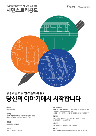 서울시는 시민의 삶과 추억이 담긴 이야기를 전문가와 협업을 통해 공공미술 작품으로 구현하는 "공공미술 시민아이디어 구현 프로젝트 ‘시민 스토리’ 공모"를 시작했다고 밝혔다. 오는 12월 16일까지 서울시 또는 디자인서울 홈페이지를 통해 응모할 수 있다.