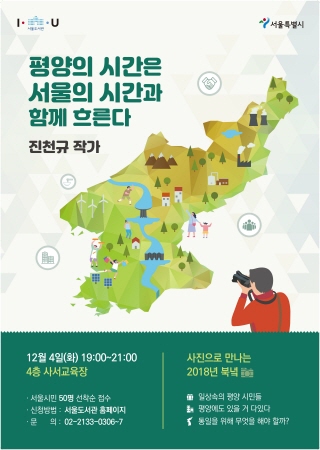 "평양의 시간은 서울의 시간과 함께 흐른다" 강연에서는 진천규 작가가 방북하여 취재를 하게 된 이유, 작가가 직접 평양을 찍은 사진과 사진에 대한 설명 등 우리가 미처 알지 못했던 평양의 모습들을 만날 수 있다. 참가자들이 진천규 작가에게 궁금한 점이나 강연 내용에 질의하는 등 소통의 시간도 가질 예정이다.