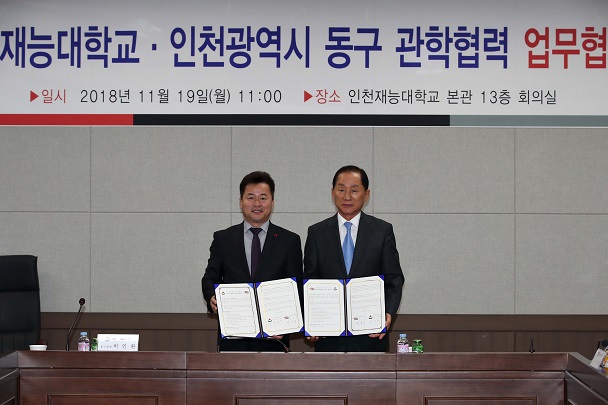 인천 동구는 19일, 재능대학교 회의실에서 재능대학과 상호 협력과 발전을 위한 관학 협약을 체결했다.