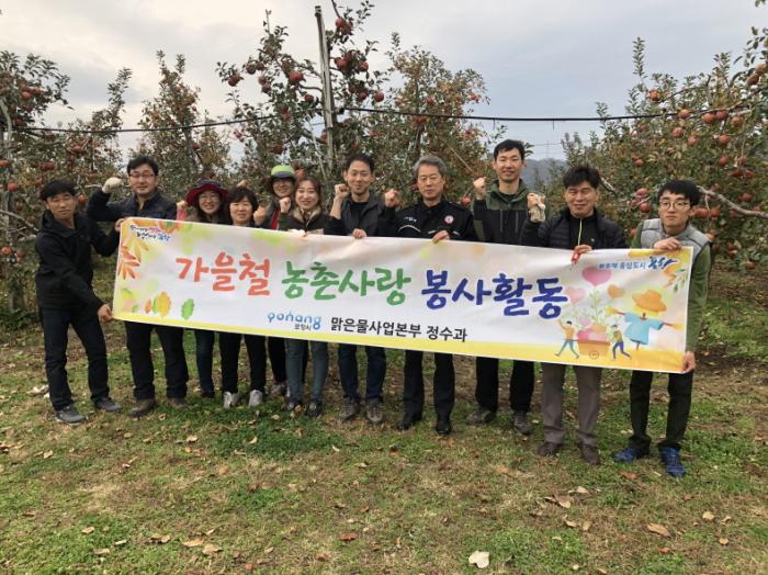 포항시 맑은물사업본부 정수과 직원 15명은 16일 수확철을 맞아 일손이 부족한 농가를 돕기 위해 기계면 화대리의 한 과수농가를 찾아 사과 수확, 선별작업을 하는 등 봉사활동을 펼쳤다.