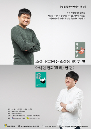 이에 교하도서관은 강사료를 지원받아 오는 22일 저녁 ‘소설에는 소설한편? 아님, 만화한편?’이라는 주제로 특별강연을 진행할 예정이다.
