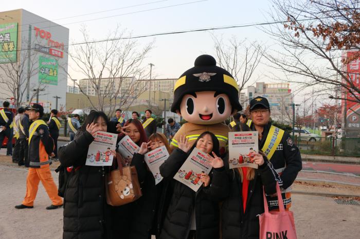 이날 캠페인은 제71회 「불조심 강조의 달」추진의 일환으로 추진되었으며, ▲ 비상구 폐쇄금지 계도 ▲주택용 소방시설 설치 촉진 홍보 ▲노후 소화기 교체 안내▲화재위험 3대 겨울용품 안전수칙 전단지 배부 등을 병행 실시하였다.
