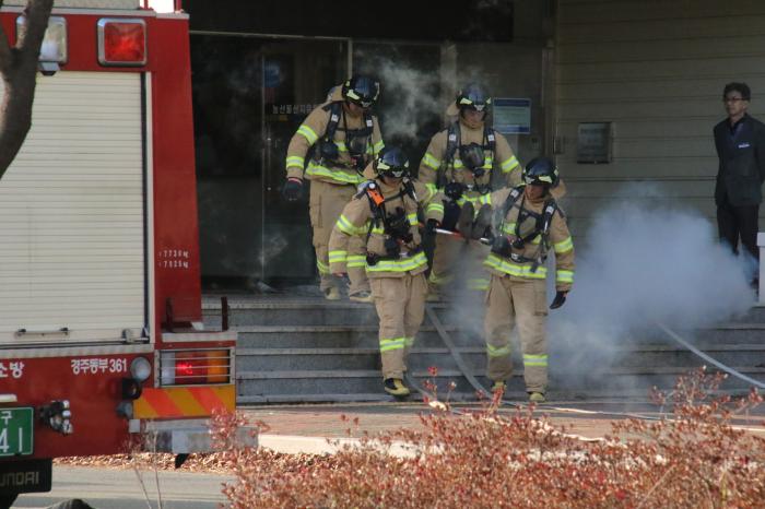 | 긴급구조통제단 불씨가동훈련중인 경주 소방서 대원들 <미디어 타임즈> |