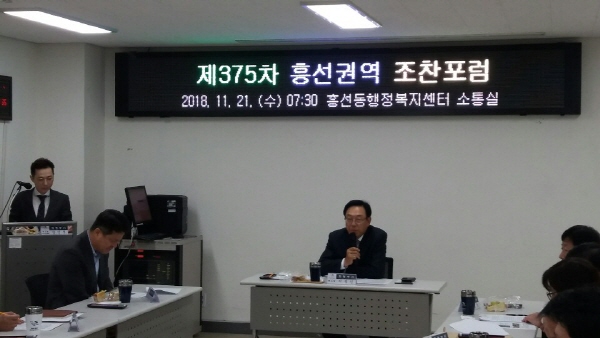 의정부시 흥선동 행정복지센터는 21일 흥선동 행정복지센터 3층 소통실에서 ‘의정부시 전통시장가의 효율적인 도로점용관리 개선방안’을 주제로 제375차 조찬포럼을 실시했다.