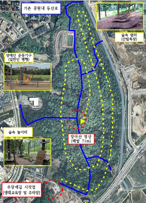 남동구는 확보된 국비와 함께 구비를 편성하여 총 사업비 12억원으로 장아산 내 수목의 훼손 없이 무장애길 약 2km, 삼림욕장, 휴게 데크, 장애인 운동 시설 등을 설치할 예정이다.