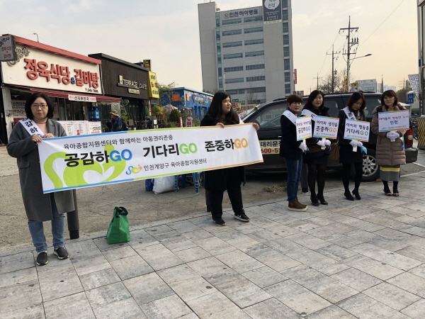 인천 계양구육아종합지원센터는 아동학대예방의 날인 지난 19일 관내 어린이집 원장 및 영유아를 둔 부모 30여 명과 함께 계산역사거리에서 아동학대예방을 위한 캠페인을 진행했다고 21일 밝혔다.