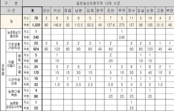 주요 사업내용을 살펴보면농촌중심지 활성화 1개소 240억원, 기초생활거점 23개소건 924억원, 마을만들기사업 39개소 220억원, 시군역량강화 10개소 33억, 농촌다움복원 4개소 80억, 농촌형 공공임대주택 1개소 23억이다.