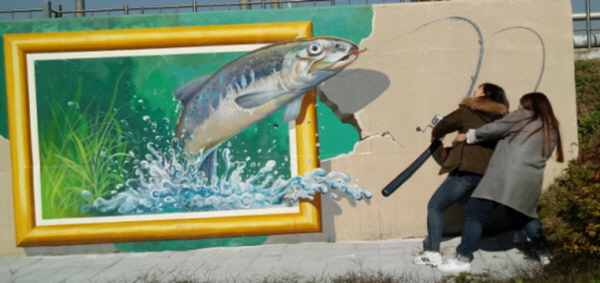 성남시 수정구 복정동 수질복원센터의 시설 벽면에 입체 벽화가 등장해 눈길을 끌고 있다. 성남시는 최근 2000만원을 들여 이곳에 강물 속 물고기 낚시를 트릭아트로 표현한 30m 길이의 벽화를 그렸다. 트릭아트는 사람의 착시효과를 이용해 평면인 작품을 입체적으로 느끼게 표현하는 예술작품이다.