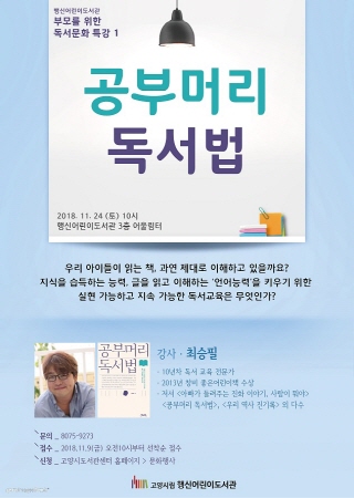 고양시 행신어린이도서관은 오는 24일과 12월 1일 오전 10시부터 12시까지 도서관 3층 어울림터에서 관내 부모를 대상으로 ‘부모를 위한 독서문화 특강’ 프로그램을 진행한다.