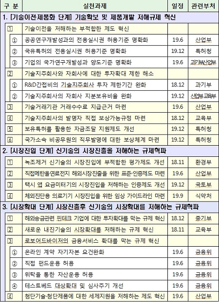 이날 논의된"신기술 사업화 촉진을 위한 규제혁신 추진방안"의 주요 내용은, 기술이전·제품화 단계, 기술확보와 제품개발 저해 규제혁신, 기술이전·제품화 단계, 기술확보와 제품개발 저해 규제혁신, 시장확대 단계 시장진출 후 신기술의 시장확대를 저해하는 규제혁파 등이다.